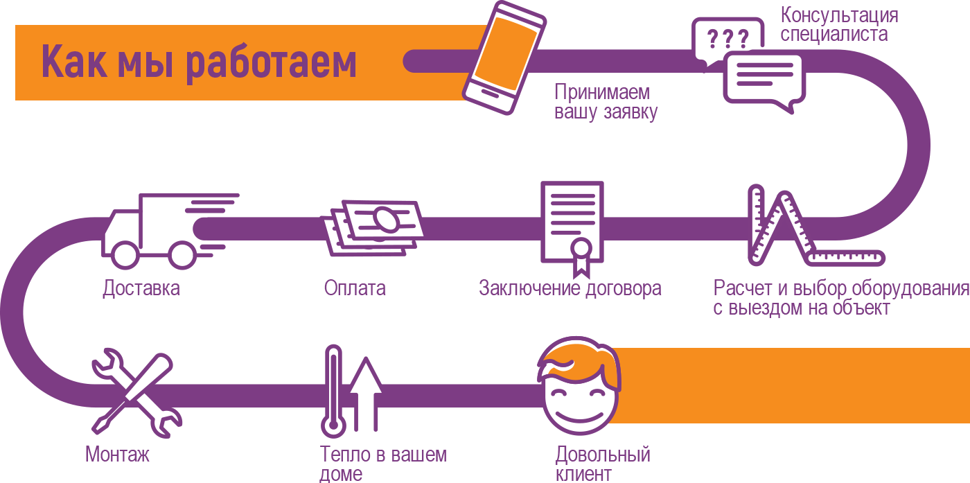 Отправьте заявку на сайте или по телефону – Мы перезвоним и проконсультируем – Выедим на объект, если необходимо - Бесплатно сделаем расчет – Заключим с вами договор – Вы вносите оплату – Мы поставляем и монтируем систему отопления – У вас тепло и отличное настроение