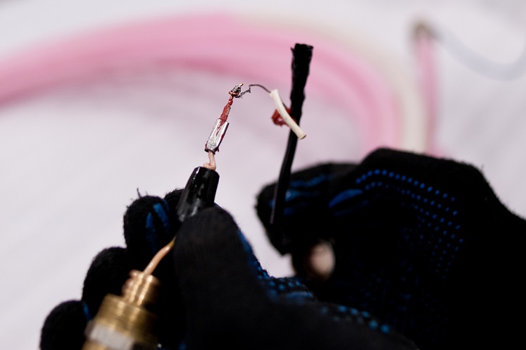 4. НЕНАДЕЖНОЕ СОЕДИНЕНИЕ ПРОВОДОВ. Соединение нагревательного с холодным концом выполнено путем грубой скрутки нагревательного кабеля и холодного конца (на фото видно насколько некачественно сделана эта «кустарная» подделка).